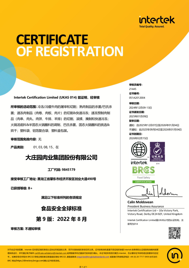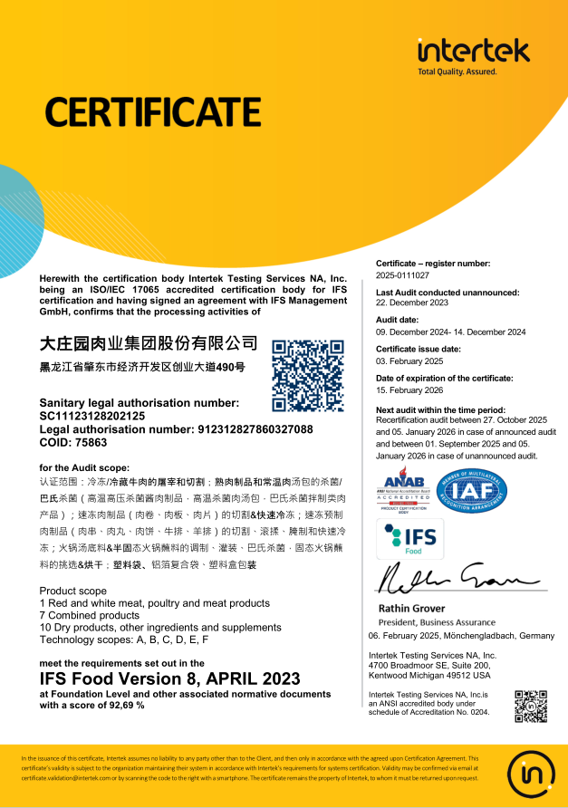 2021年1月,通過歐洲國際雙體系質(zhì)量認(rèn)證(BRCGS、IFS)。